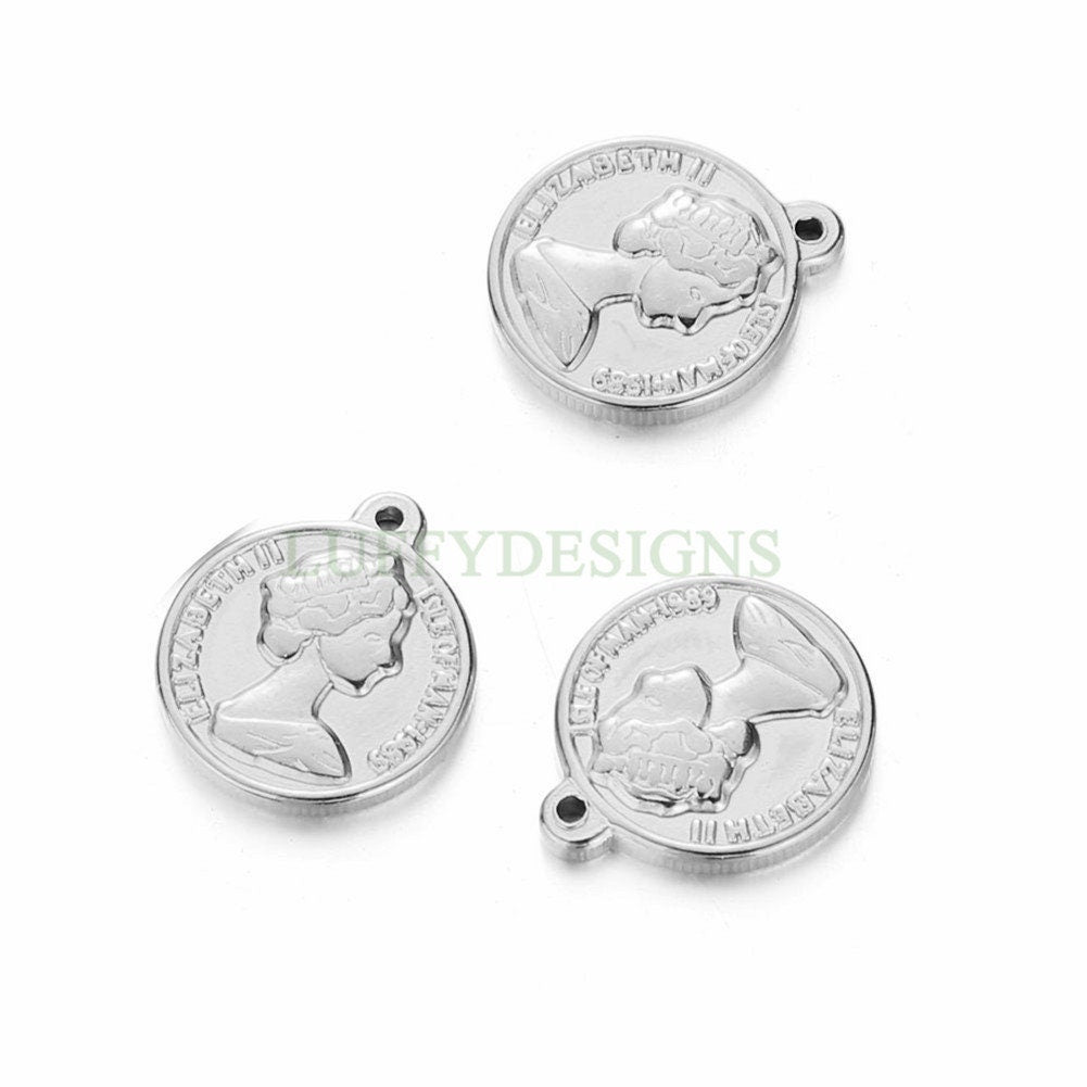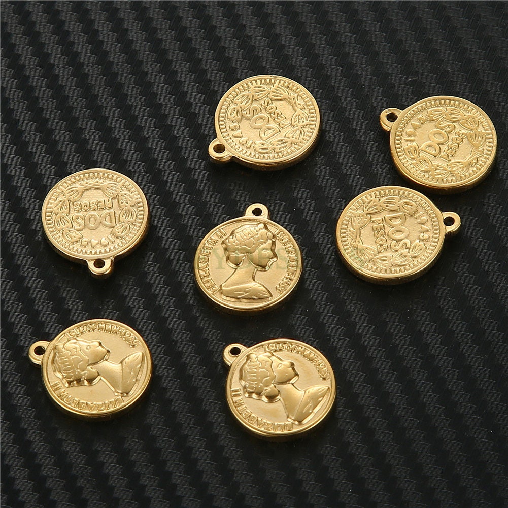 5pcs Queen Elizabeth II Charms, Gold Coin Pendant, Dainty Elizabeth Medallion Charm Pendant, Gold plated Stainless Steel, Vintage Coin Charm
